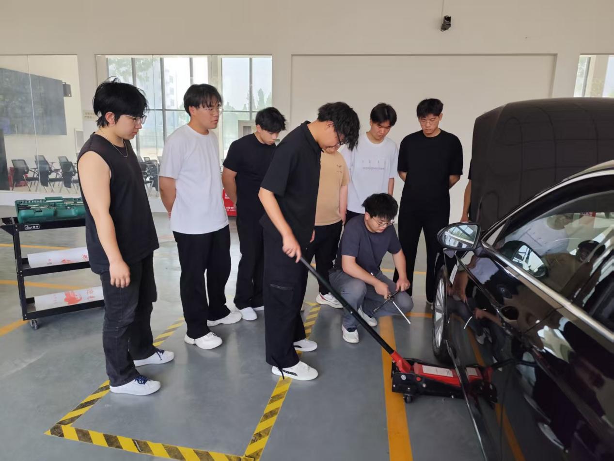 比赛现场气氛热烈,来自不同班级的参赛选手们精神抖擞、斗志昂扬。随着裁判一声令下,选手们迅速投入到紧张的比赛中。他们熟练地操作着千斤顶,精准地将车辆顶起,然后有条不紊地拆卸轮胎螺丝、取下旧轮胎、安装新轮胎并紧固螺丝。每一个动作都展现出扎实的专业功底和娴熟的操作技能。