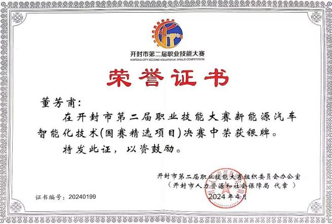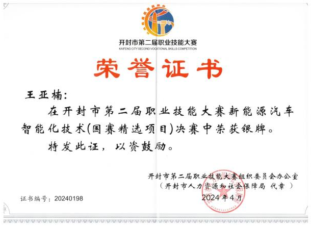 本次大赛由开封市人民政府主办,旨在全面检验和提升全市职业技能人才的专业素养和综合能力。在新能源汽车智能化技术项目的比赛中,公司参赛教师王亚楠、董芳甫展现出了高超的技能水平和出色的团队协作能力。他们凭借扎实的专业知识、精湛的操作技艺和冷静的应对能力,在比赛中脱颖而出,荣获银奖。这一成绩的取得,不仅是对公司参赛选手个人努力的肯定,更是对公司新能源汽车技术专业教育水平的认可。