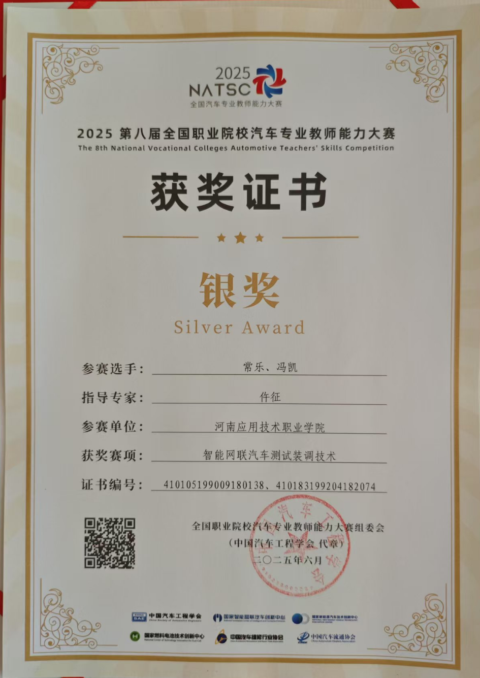 2025年6月22日,第八届全国职业院校汽车专业教师能力大赛“风向标杯”智能网联汽车测试装调技术赛项正式拉开帷幕,经过两天的激烈角逐,公司教师冯凯、常乐老师在副经理仵征带队下获得高职组银奖。